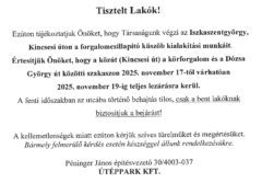 Az önkormányzat értesíti a lakókat és ingatlantulajdonosokat, hogy a Kincsesi út és a Kossuth utca kereszteződésében lévő gyalogosátkelőhelyet megemelik, fizikai akadályt képezve az áthaladó járművek számára, ezzel a KRESZ-szabályok betartását elősegítve. 2025.11.12. – bontási munkák kezdete 2025.11.12–14. – félpályás útlezárás a 8202-es számú Kincsesi úton 2025.11.17–19. – teljes útlezárás, behajtani csak az ott lakóknak lehet A lezárás idején az átmenő és helyi forgalmat a körforgalomtól a Petőfi utca irányába, majd a Kossuth tér felé terelik. Az önkormányzat kéri a lakókat, hogy körültekintően közlekedjenek, és figyeljenek arra, hogy a gyerekek csak a gyalogosjárdát használják. . . . → Tovább . . .