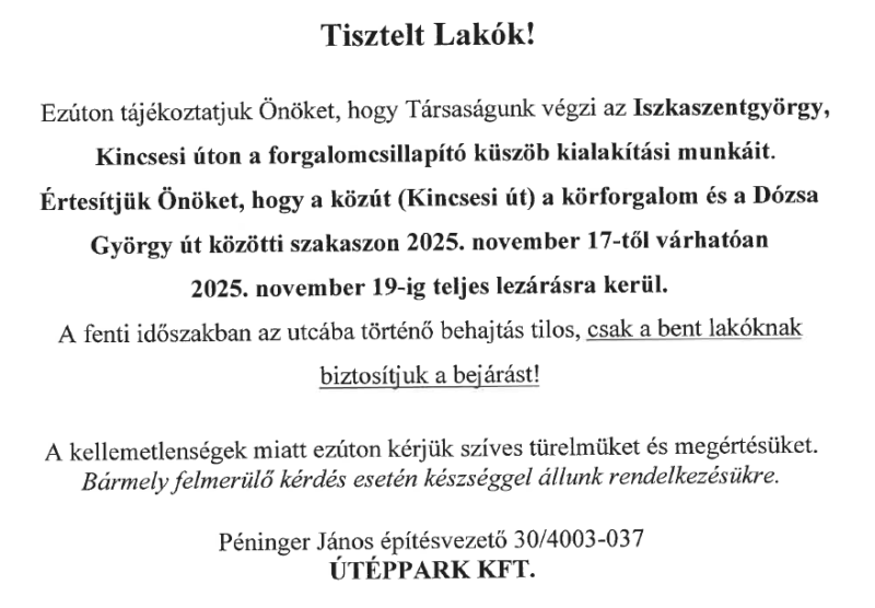 Kincsesi út – Kossuth utca gyalogos átkelőhely átépítése miatt útlezárás 2025.11.12-19 közt